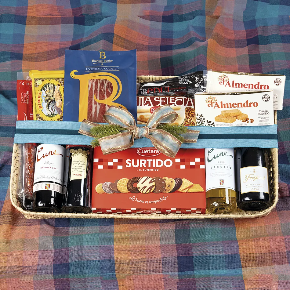 Bandeja2 es el lote navideño definitivo con paleta ibérica de cebo IBÉRICOS BENITO como protagonista, acompañada de salchichón y chorizo de bellota IBEDUL. Brinda con cava FREIXENET Blanc de Blancs brut nature y vermouth clásico YZAGUIRRE, y marida con CUNE crianza (D.O. Rioja) y CUNE verdejo (D.O. Castilla y León). ¡Haz tu pedido y disfruta del auténtico sabor ibérico!