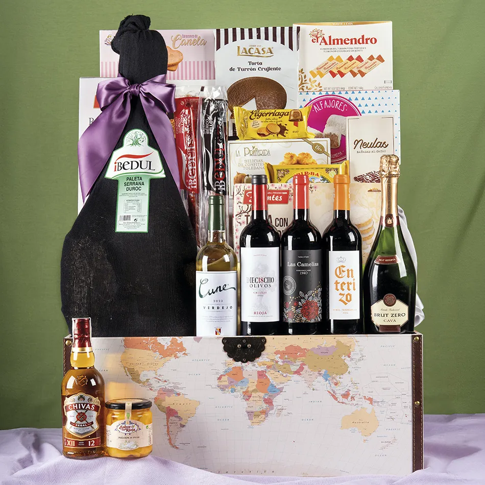 El Baúl Acuario reúne una paleta serrana Duroc como pieza central, dos ibéricos de bellota para completar la tabla y una selección amplia de bebidas: whisky 12 años, cava brut nature, tres tintos (Rioja, selección y D.O. Utiel-Requena) y un blanco verdejo. Se completa con una mesa dulce variada de turrones, chocolate y repostería tradicional, además de un toque de conservas y un detalle lúdico de participación navideña.