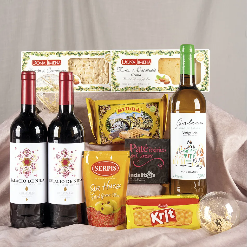 Incluye 2 botellas de vino tinto bobal tempranillo PALACIO DE NIDA con D.O. Utiel-Requena, una denominación reconocida por sus tintos con carácter, y una botella de vino blanco GALECU de Galicia, ideal para aperitivos y mariscos. Una combinación perfecta para maridar durante las celebraciones navideñas.