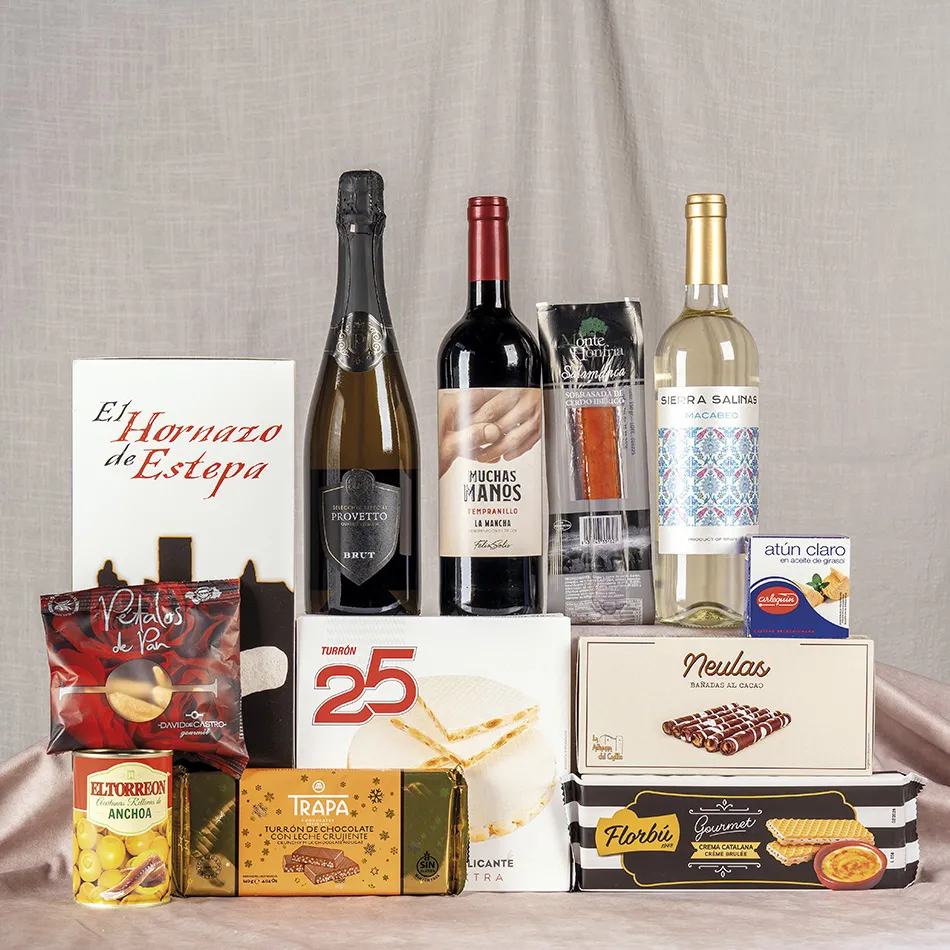 La selección incluye una botella de vino tinto tempranillo MUCHAS MANOS con D.O. La Mancha, una botella de vino blanco Macabeo SIERRA SALINAS con D.O. Utiel-Requena y un cava brut PROVETTO selección especial premium. Tres opciones para acompañar desde aperitivos hasta platos principales y postres.