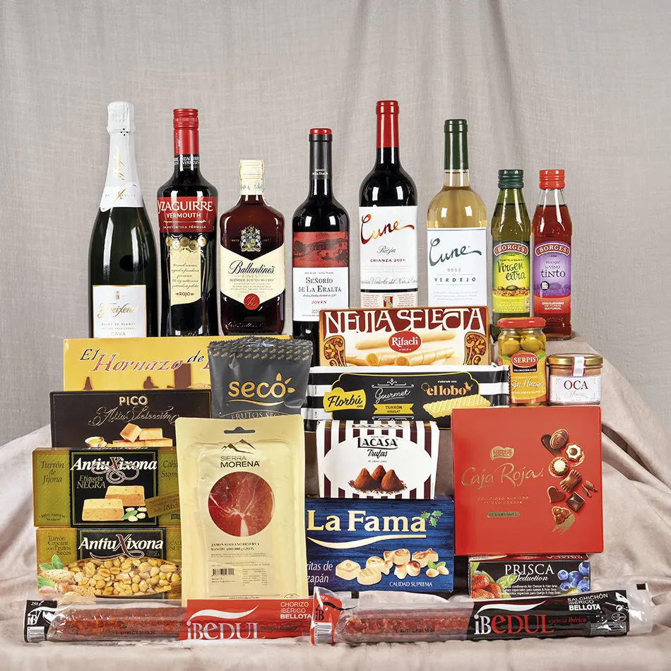 El apartado de bebidas combina destilados, vinos y vermouth. Destaca el whisky BALLANTINES (50 cl.), perfecto para brindar en sobremesas. El cava FREIXENET Blanc de Blancs brut nature ofrece frescura y elegancia en los brindis navideños. Los vinos tintos Rioja SEÑORÍO DE LA ERALTA y Rioja CUNE crianza son ideales para maridar con carnes y platos principales, mientras que el vino blanco 100% verdejo CUNE D.O. Castilla y León aporta notas frescas y frutales para acompañar entrantes y pescados. Completa la selección el vermouth YZAGUIRRE clásico rojo, perfecto para aperitivos con un toque tradicional.