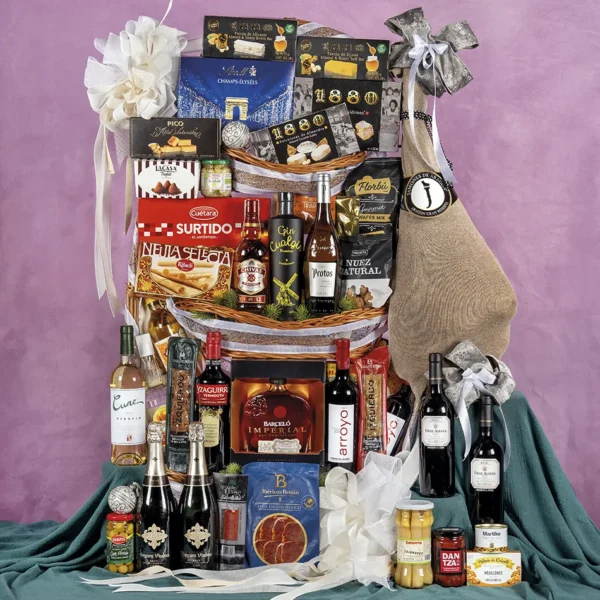 La Cesta Lujo combina jamón de Teruel, embutidos ibéricos, destilados premium, vinos con D.O. y turrones 1880 en una selección gourmet única. Incluye conservas delicatessen y postres navideños en una cesta de 3 pisos. Ideal para regalar con elegancia en Navidad.