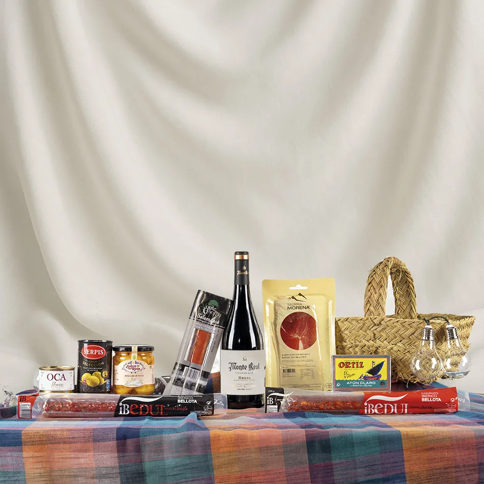 Completa con aceitunas rellenas de anchoa SERPIS Gran selección, 300 g de mousse de oca trufado LA MAISON DES PÂTES, atún claro ORTIZ estuchado y melocotón en almíbar SABOR DE RIOJA para un toque gourmet en cada bocado.