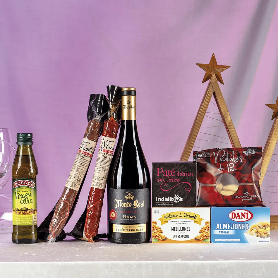 El Estuche 705 une un Rioja MONTE REAL Reserva 90 aniversario con un dúo de ibéricos de bellota D’FIALLO y acompañamientos gourmet: AOVE BORGES, paté con cerezas INDALITOS, pétalos de pan y conservas del mar (almejones DANI y mejillones PALACIO DE ORIENTE). Un set listo para montar una tabla completa y brindar.