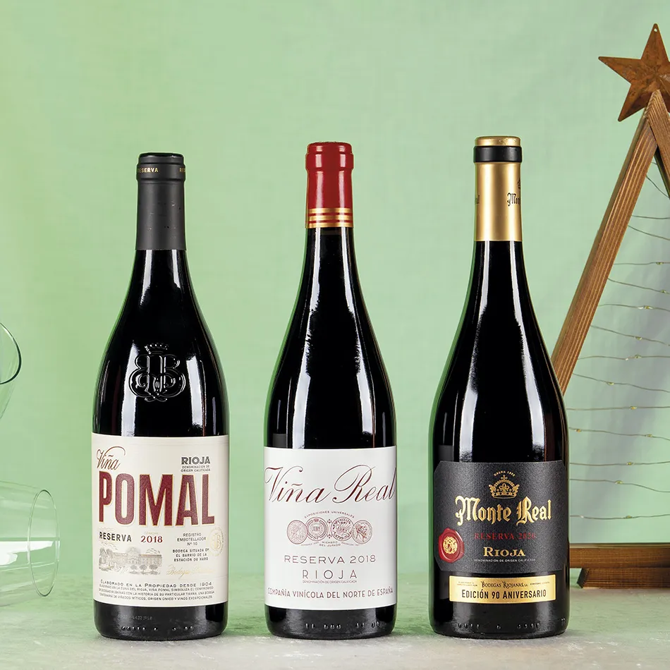Sirve Viña Pomal Reserva y Viña Real Reserva a 16–18 °C para equilibrar fruta y roble. Monte Real Reserva Ed. 90 Aniversario a 18 °C liberará sus matices de especias y madera.