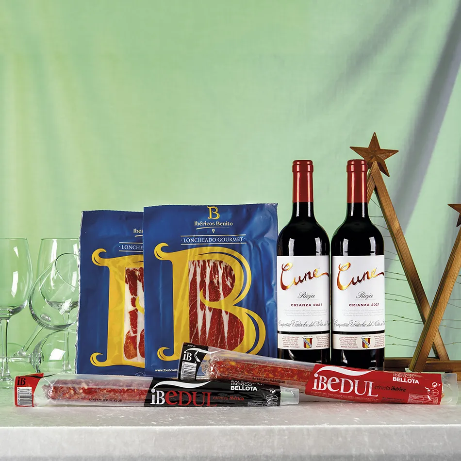 Estuche 713 reúne la paleta ibérica de cebo Ibéricos Benito, chorizo y salchichón de bellota IBEDUL, y dos botellas de Rioja CUNE Crianza. Una selección premium que aporta sabor auténtico y sofisticación a tus encuentros. Perfecto para compartir un aperitivo gourmet con estilo. ¡Haz tu pedido hoy!