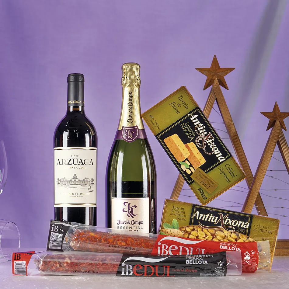 Estuche 718 reúne salchichón y chorizo ibéricos de bellota IBEDUL, Vino tinto Arzuaga Crianza D.O. Ribera del Duero y Cava Juvé y Camps Brut Reserva D.O. Penedès, junto a turrones Jijona y Crocant Antiu Xixona calidad suprema. Selección equilibrada que combina tradición y sofisticación para celebrar con estilo. ¡Haz tu pedido ahora!