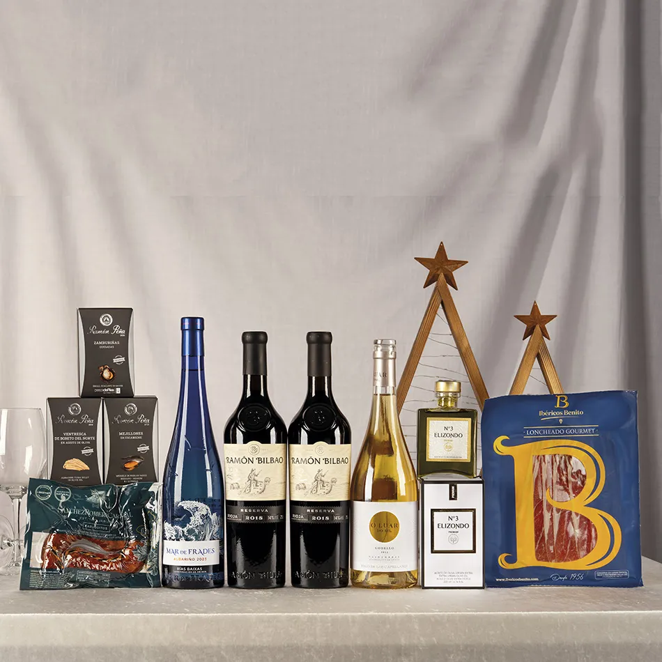 Los blancos Godello O Luar do Sil (D.O. Valdeorras) y Albariño Mar de Frades (D.O. Rías Baixas) aportan frescura y notas cítricas. Los tintos Ramón Bilbao Reserva (75 cl c/u, D.O. Rioja) ofrecen taninos suaves y matices de madera.