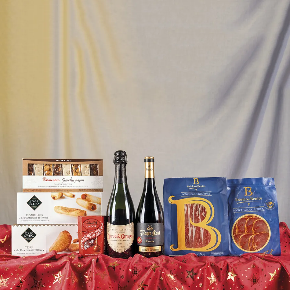 Gourmet 5 combina loncheados de paleta ibérica y lomo ibérico IBÉRICOS BENITO, el Cava Juvé y Camps Reserva de la Familia Brut Nature Gran Reserva y el Rioja Monte Real Reserva Ed. 90 Aniversario, junto al surtido de turrones El Almendro, cigarrillos y tejas de Tolosa y bombones Lindor. Una selección navideña premium para triunfar en tus celebraciones.