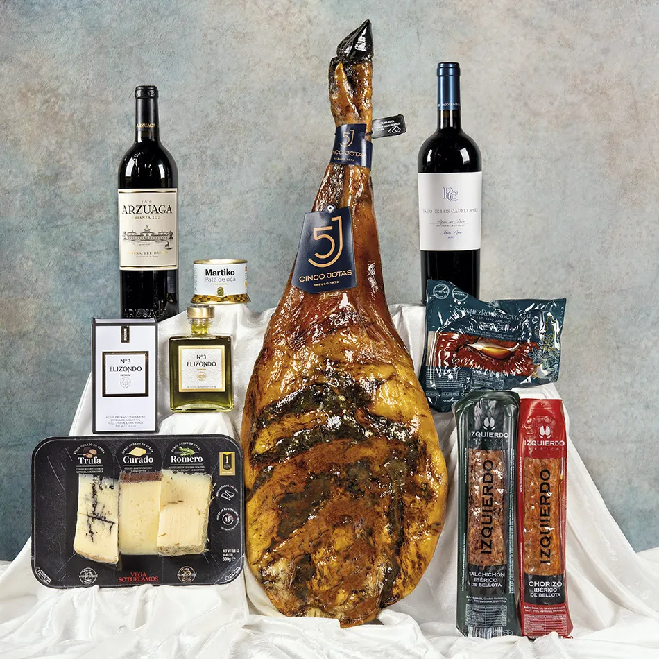 La paleta ibérica de bellota 100% Jabugo 5J SÁNCHEZ ROMERO CARVAJAL (5 a 6 kg aprox.) es la joya de esta jamonera, un producto de prestigio internacional, ideal para regalar o degustar en celebraciones exclusivas. Se acompaña del salchichón cular ibérico de bellota IZQUIERDO y el chorizo cular ibérico de bellota IZQUIERDO, que destacan por su sabor intenso y su curación artesanal. Los jabuguitos de chorizo ibérico 100% bellota SÁNCHEZ ROMERO CARVAJAL aportan un formato práctico y sabroso para aperitivos. Completa la selección una tabla de 3 cuñas de queso VEGASOTUELAMOS (curado, trufa negra y romero), perfectas para maridar con vinos tintos.