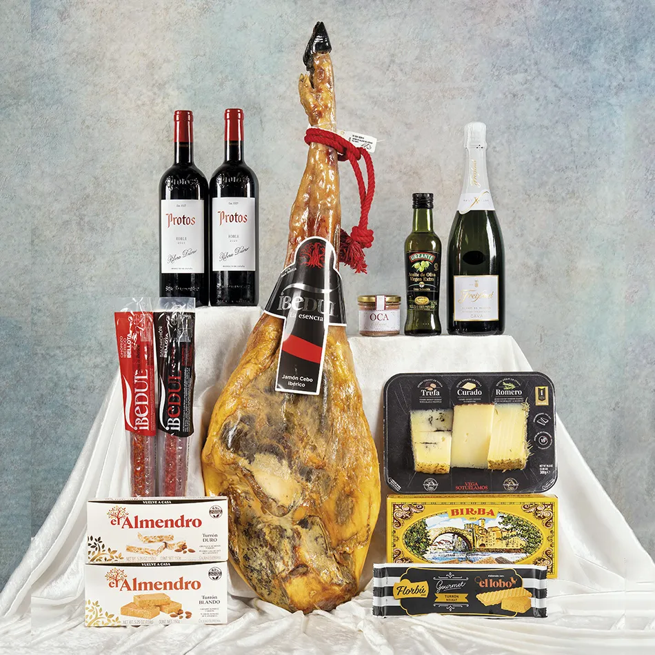 Jamonera 215 es el lote navideño de referencia en Sierra de Padelma: jamón ibérico de cebo IBEDUL brida blanca del Valle de los Pedroches (7–8 kg), chorizo y salchichón de bellota IBEDUL y tabla de tres quesos (curado, trufa y romero) Vegasotuelamos para un surtido gourmet completo.